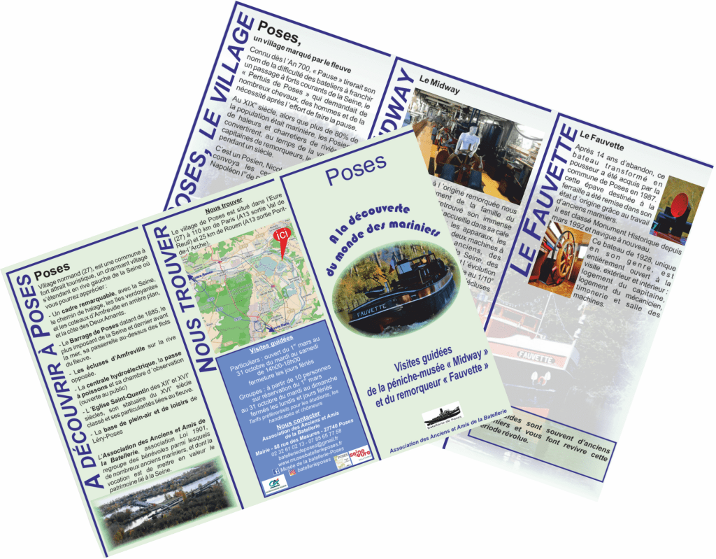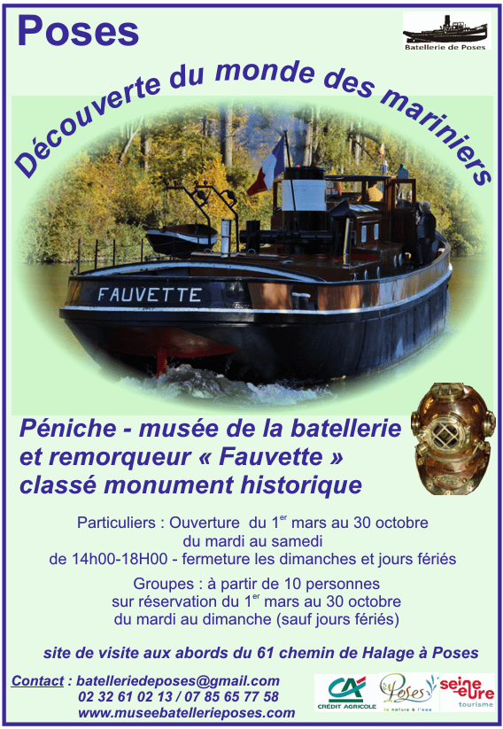 Poses, village qui s’étire le long de la Seine sur 4 à 5 km, a toujours été marqué par le fleuve et cela pendant près de 2000 ans. La Seine alors fleuve sauvage présentait une grande difficulté de navigation, le Pertuis de Poses, et presque tous les habitants travaillaient au halage des bateaux. Avec la construction du barrage et des écluses et l’apparition de la machine à vapeur au X IXe siècle, les Posiens durent se reconvertir dans le remorquage, spécialité posienne durant un siècle. Nos deux bateaux-musées sont là comme un témoignage de ces époques où 90% des hommes de ce village travaillaient pour la navigation sur la Seine. Le Fauvette est le vestige de la tradition du remorquage de cette époque révolue, et le Midway, ancien chaland, est un musée offert aux yeux curieux de nos visiteurs.