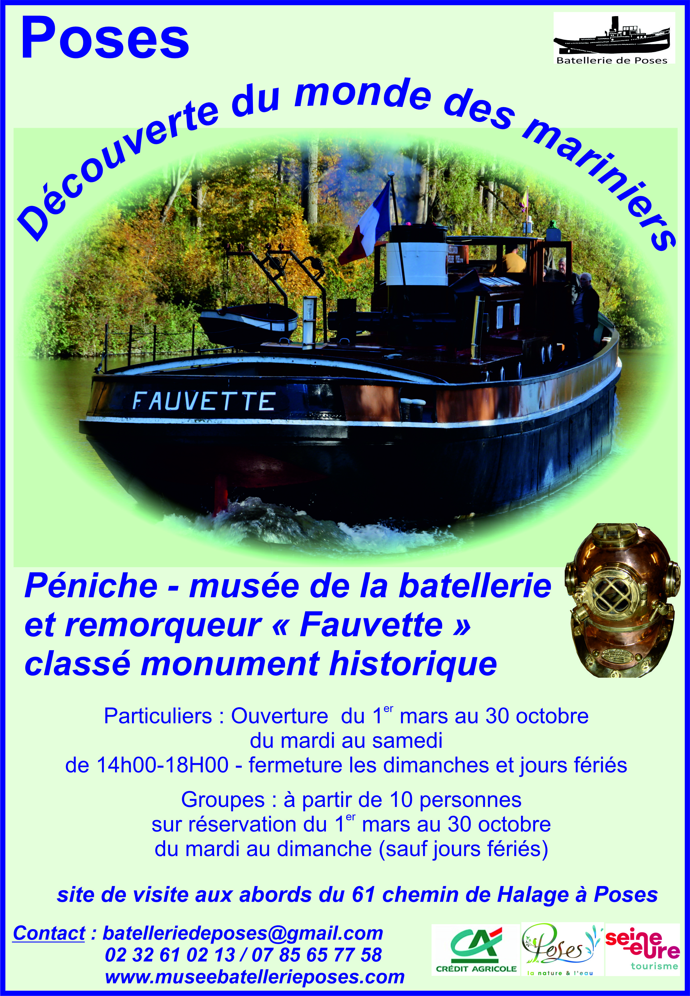 Poses, village qui s’étire le long de la Seine sur 4 à 5 km, a toujours été marqué par le fleuve et cela pendant près de 2000 ans. La Seine alors fleuve sauvage présentait une grande difficulté de navigation, le Pertuis de Poses, et presque tous les habitants travaillaient au halage des bateaux. Avec la construction du barrage et des écluses et l’apparition de la machine à vapeur au X IXe siècle, les Posiens durent se reconvertir dans le remorquage, spécialité posienne durant un siècle. Nos deux bateaux-musées sont là comme un témoignage de ces époques où 90% des hommes de ce village travaillaient pour la navigation sur la Seine. Le Fauvette est le vestige de la tradition du remorquage de cette époque révolue, et le Midway, ancien chaland, est un musée offert aux yeux curieux de nos visiteurs.
