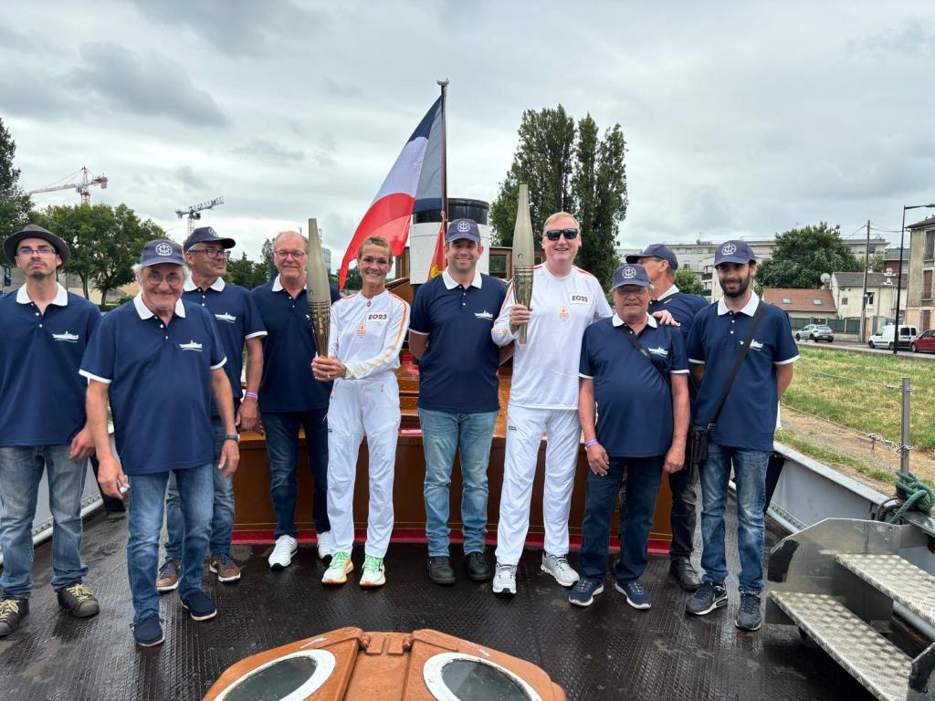 Le Fauvette sur le canal Saint-Denis avec ses deux porteurs de flamme, Mme Sol Daurella (présidente du conseil d’administration de la société Coca-Cola) et son collaborateur, avec l’équipage du bateau lors des cérémonies d’ouverture des Jeux Olympiques Paris 2024