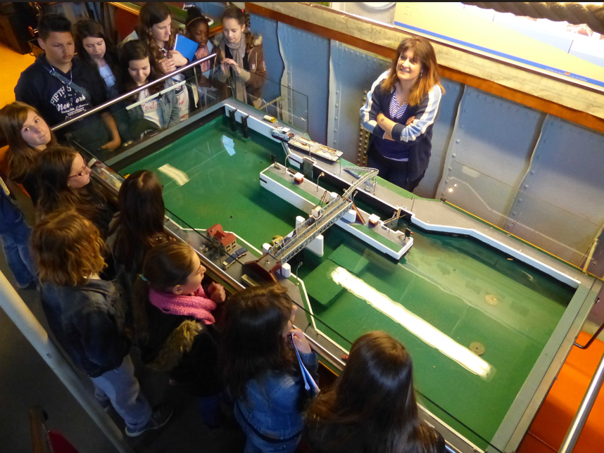 Accueil et explications aux enfants autour de la maquette des écluses et du barrage