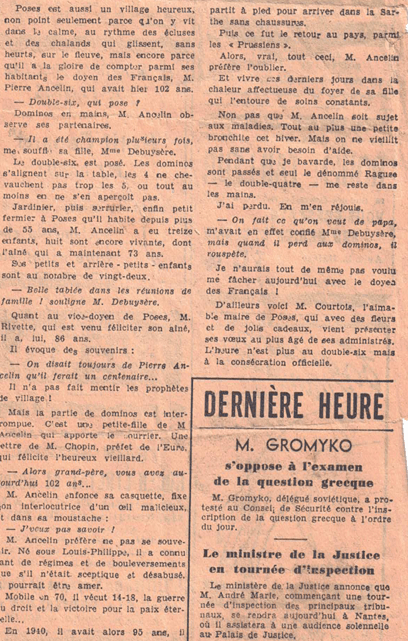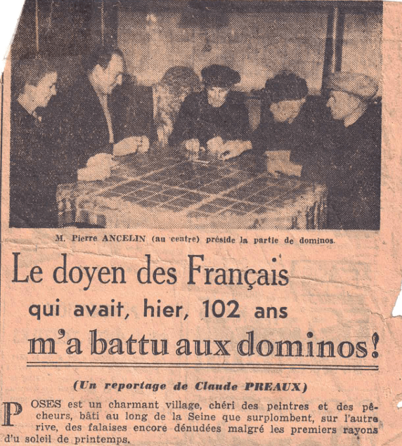 Pierre ANCELIN fut non seulement centenaire, mais aussi doyen des Français. Il décède à 103 ans (1845-1948). Il a vécu en même temps qu’un autre personnage centenaire du village : Etienne FRAGILE (1788-1890) est ainsi né sous Louis XVI, a été grognard avec Napoléon à Austerlitz et est décédé sous la troisième République.