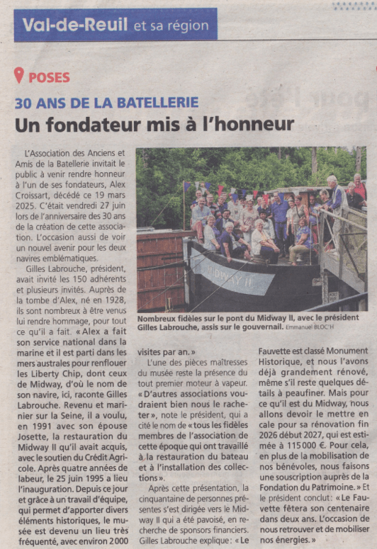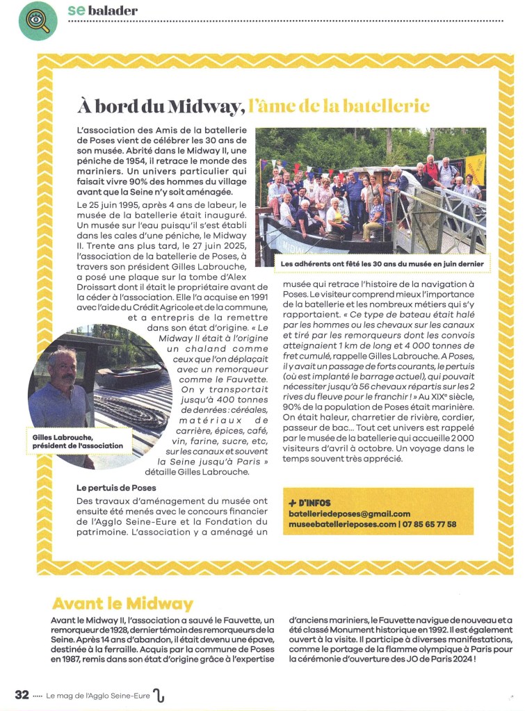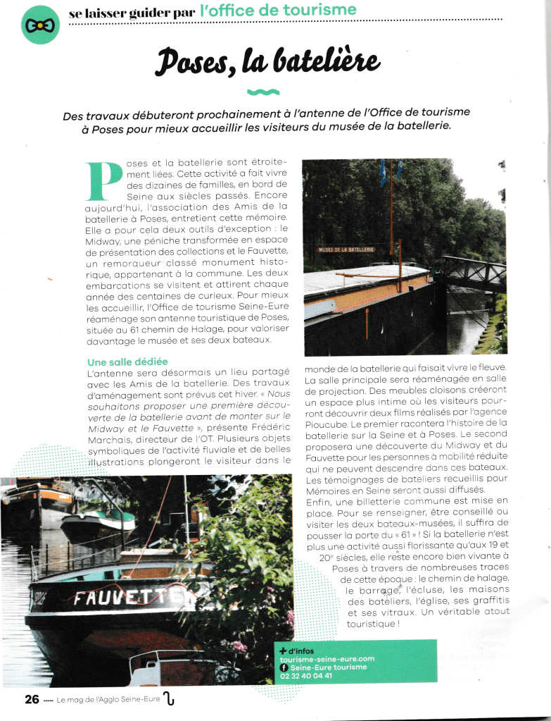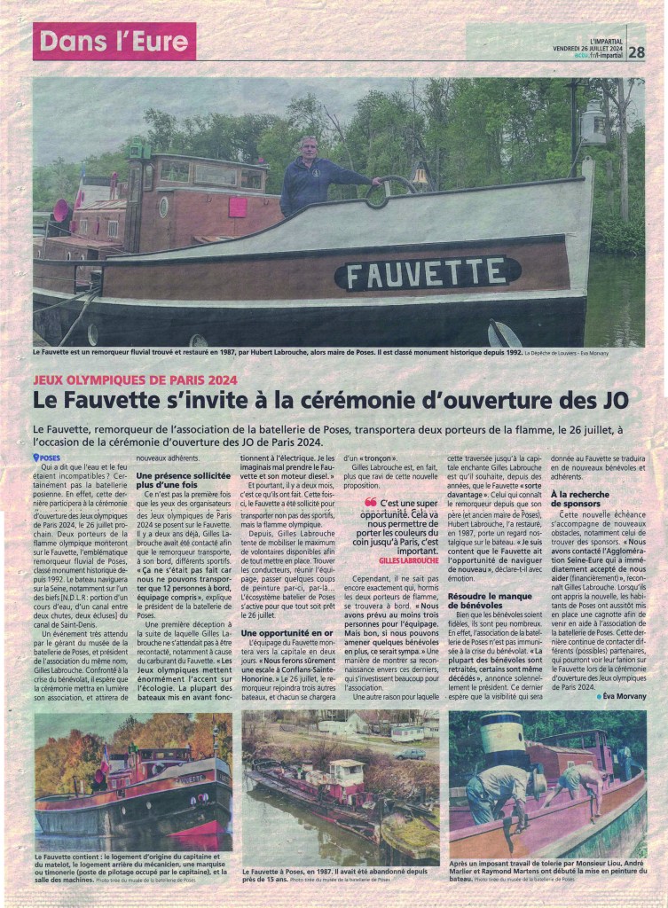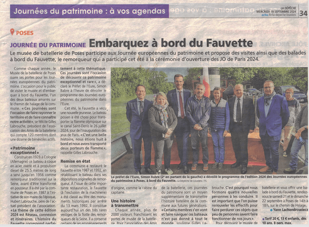 Pour le lancement des Journées Européennes du Patrimoine de septembre 2024, nous avons eu la chance d’accueillir Monsieur le Préfet de l’Eure, Monsieur le Sous-Préfet, Madame la Vice-Présidente du Département, Monsieur le Président de la CASE, Madame l’Architecte des Bâtiments de France et Monsieur le Maire de Poses et ses adjoints à bord du Fauvette. Version renouvelée sur le thème « le patrimoine des itinéraires, des réseaux et des connexions et le patrimoine maritime ». Une occasion de naviguer pour faire découvrir notre Seine locale. De bons moments, et l’on remercie nos visiteurs.
