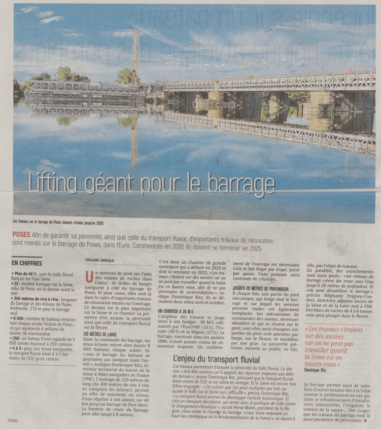 Visite du chantier de rénovation du barrage de Poses : réfection des ponts de l’ouvrage, rénovation de l’ensemble de la vantellerie et des mécanismes associés, de confortement des radiers… à suivre ! estimation du montant des travaux : 39 Millions d’Euros