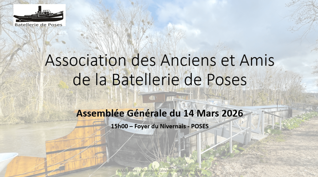 Notre prochaine Assemblée Générale de l’Association des Anciens et Amis de la Batellerie de Poses se tiendra le samedi 24 Février 2024 à 14h30 au Foyer du Nivernais à Poses. Vous serez tous les bienvenus. Nous comptons sur votre soutien.